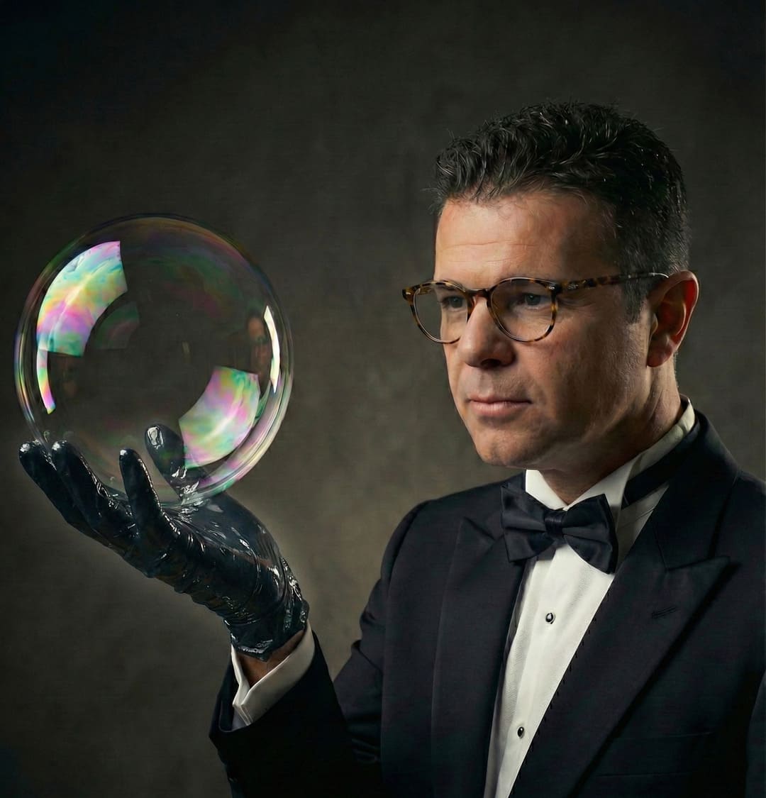 A: José Ángel applies the scientific method to art. His background as a Pharmacist and Optometrist allows him to develop proprietary chemical formulas for stronger bubbles and to master light interference (iridescence) using precise stage lighting. You are not just hiring a performer; you are hiring an expert in the manipulation of matter and light.